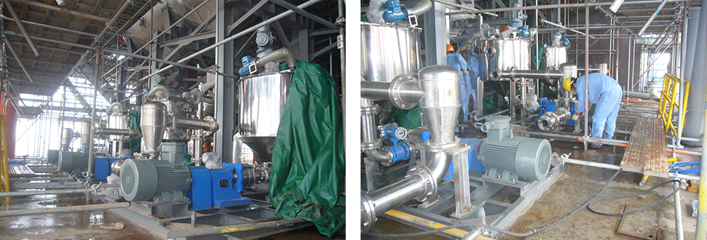 HFM型分散研磨器装置(撬)由溶解罐、分散研磨机和混合器组成。溶解罐设有切向的一次进水口,进水与上部的物料进入罐内,罐顶的搅拌机使其旋转搅拌,达到初步的混合。随后由下部的出口进入分散研磨机,使通过机器的物料能同时完成粉碎、分散、乳化、均质和输送。混合器利用文丘里管形分配器把分散粉碎机的来液和二次进水送入旋流混合和静态混合,以达到均匀分散溶解的最佳效果。